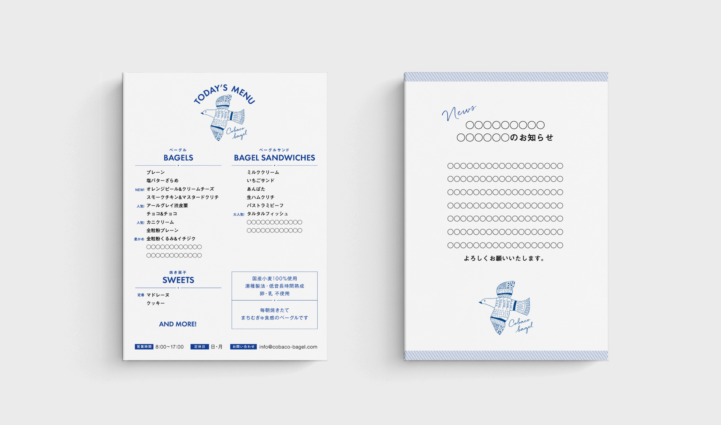 ロゴ、「しあわせを運ぶ青い鳥」が狛江・和泉多摩川の空を羽ばたき、ベーグルを届けるというストーリーをベースにデザイン。温かみのある手描きのタッチで、店主さんの理想とするお店の姿を視覚化しています。