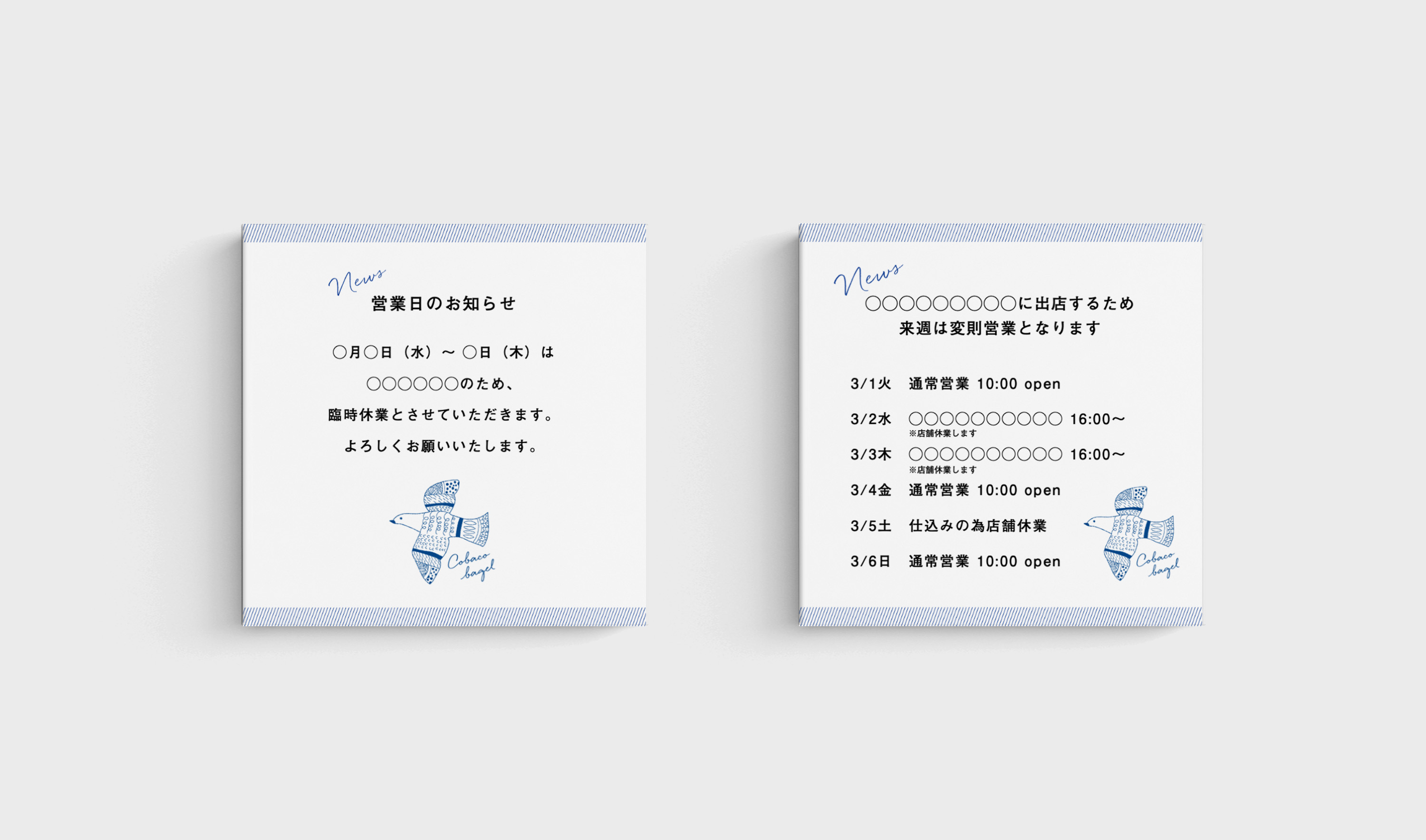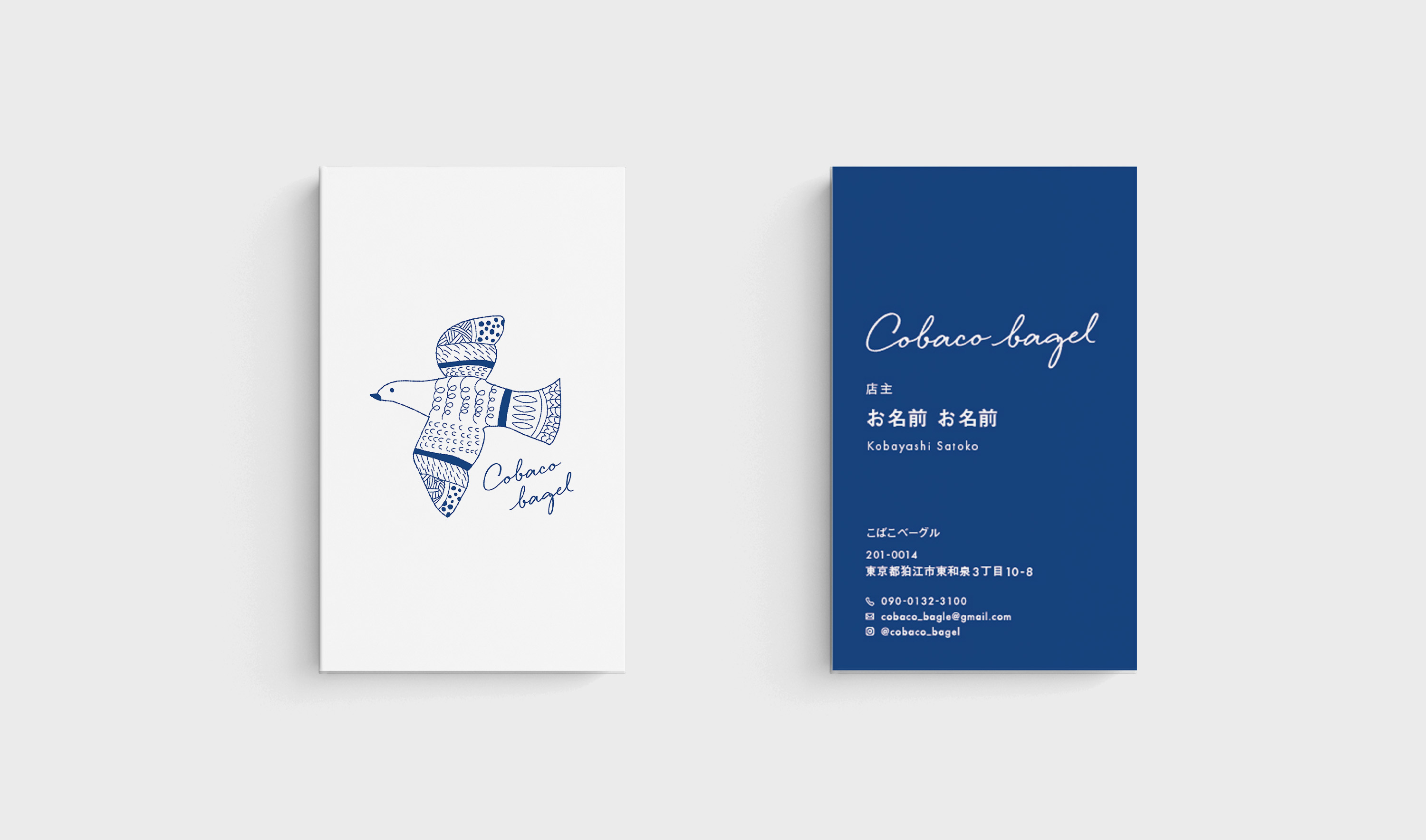 現在、東京都狛江市で営業しているベーグル専門店「こばこベーグル」の立ち上げに伴い、店主さんと、ゼロからブランドを構築。店名の決定からコンセプト設計、ロゴ制作に至るまで、店主さんの想いやアイデアを大切にし、対話を重ねながらブランドづくりを行いました。