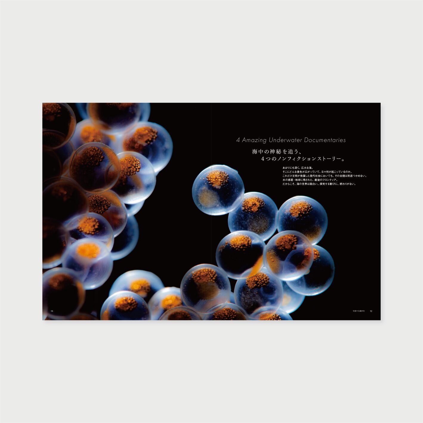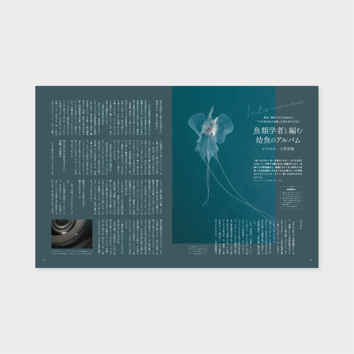 第1号表紙には、高砂さんの作品から、配色のコントラストが美しい魚群の写真を選定。直接的にダイビングの様子を捉えたものではなく、抽象度を上げたグラフィカルなキービジュアルにすることにより、単なる情報誌とは異なり、広い視座から海の美しさとおもしろさ、そして大切さを伝えるという本誌のコンセプトを表現しています。