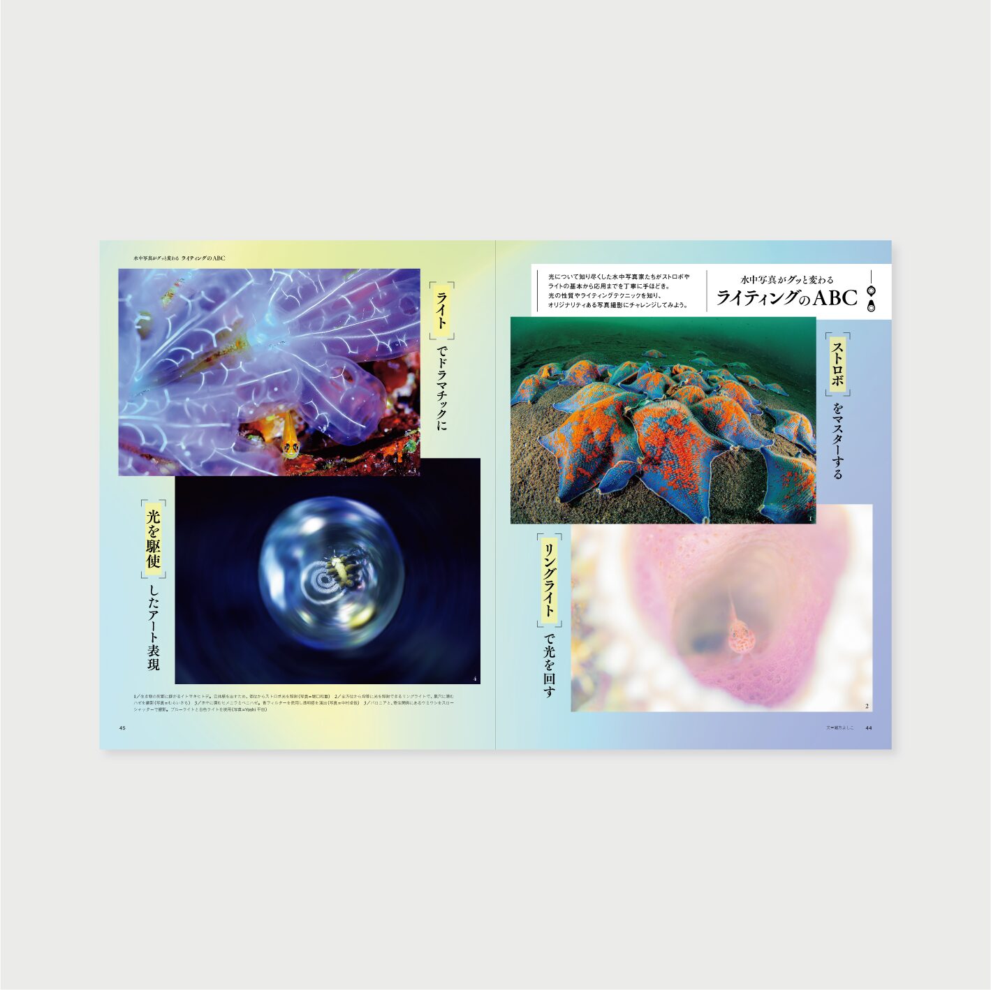 場所や時間によってさまざまな表情を見せる海。それを反映するように、各企画ページのデザインもバラエティに富んだものにしました。撮影時の「ライティング」のノウハウを伝えるページでは、柔らかな光のグラフィックを背景に。「フォトジェニック」を強調するページでは、写真の美しさを際立たせる程度のエモーショナルな配色とあしらいを採用しています。ページを開くと直感的に企画のイメージが入ってきて、ワクワクしながら読み進めていただけるようなデザインに。