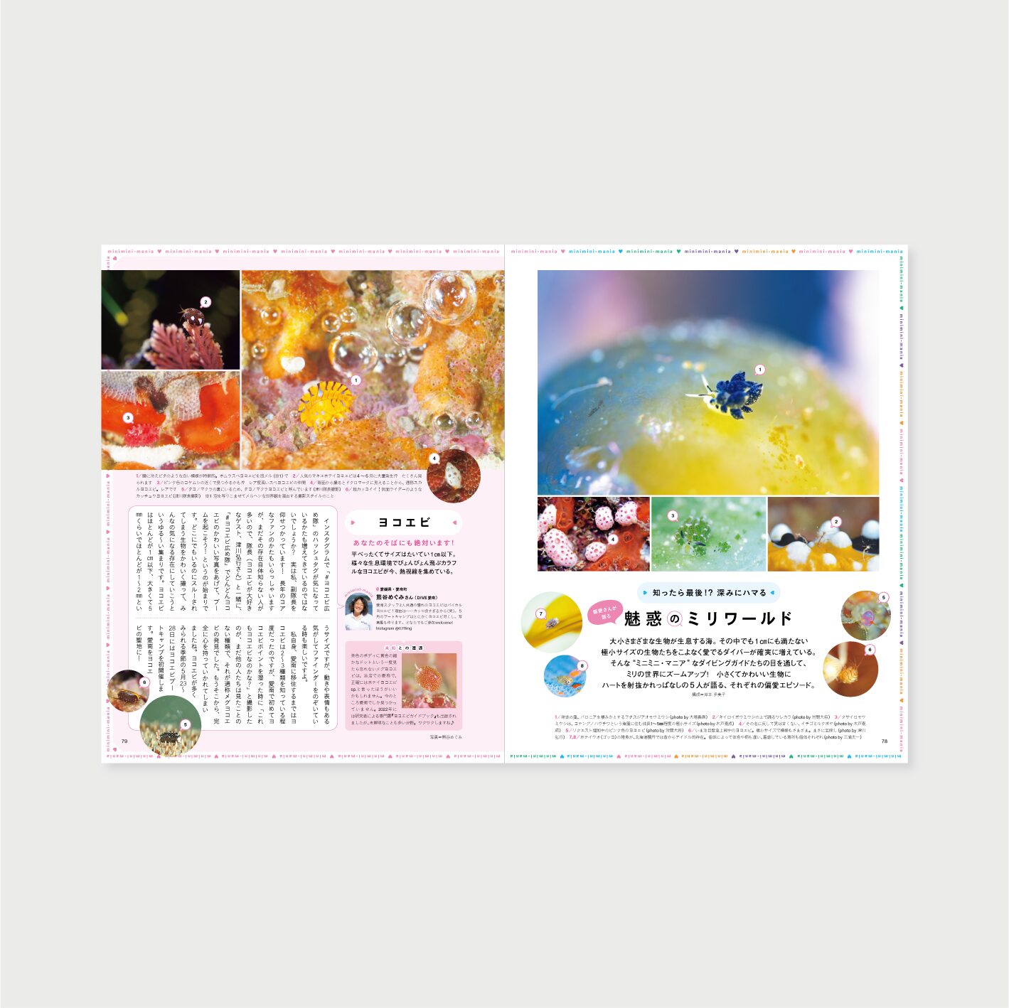 高砂さんが撮影した作品を主題にした巻頭グラビア&エッセイ、ダイビングや水中撮影スポットの紹介、水中写真の機材や技術の紹介、魚類学者とダイバーの対談など、さまざまな角度から海とダイビングを楽しめる誌面に生まれ変わりました。